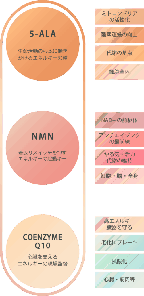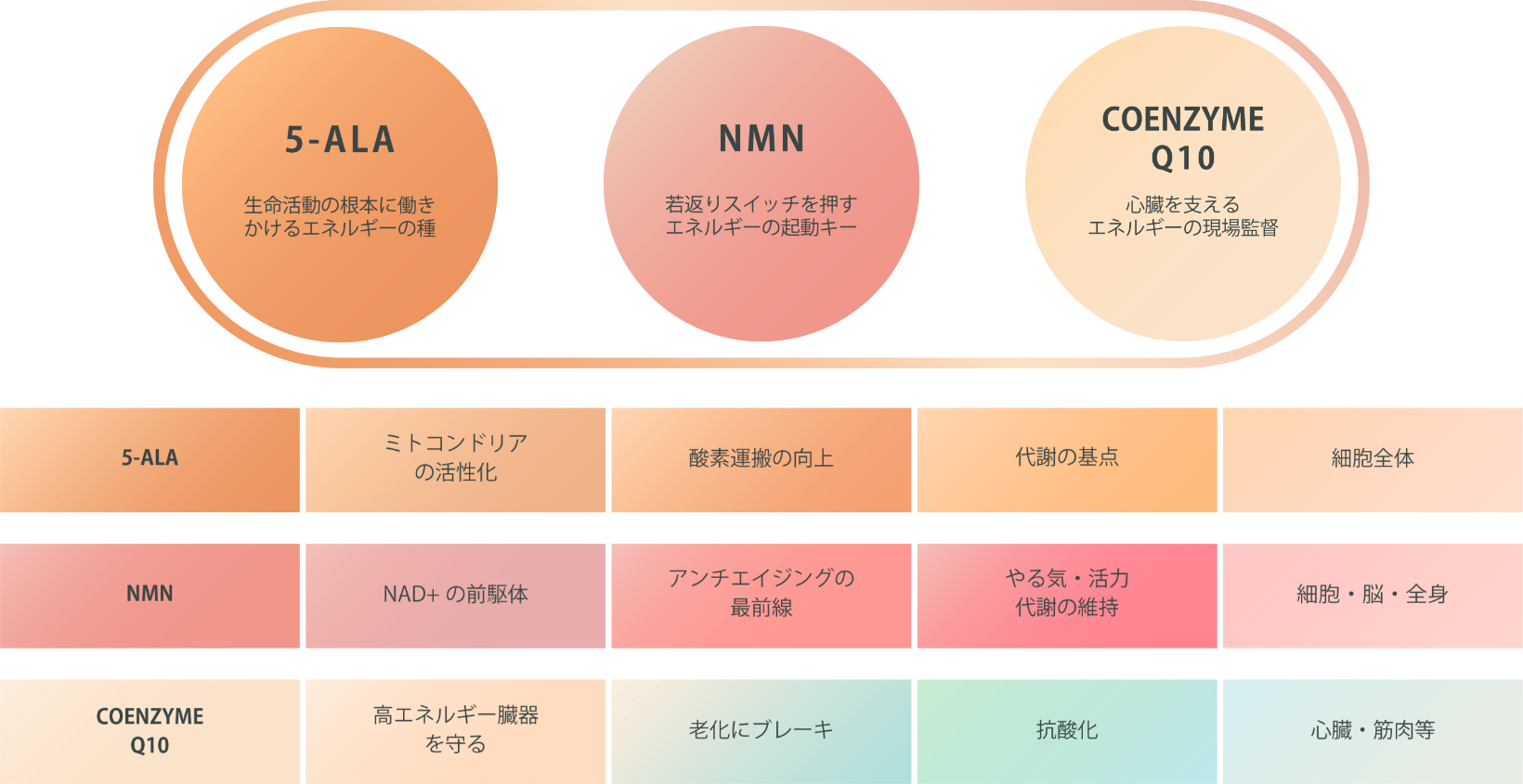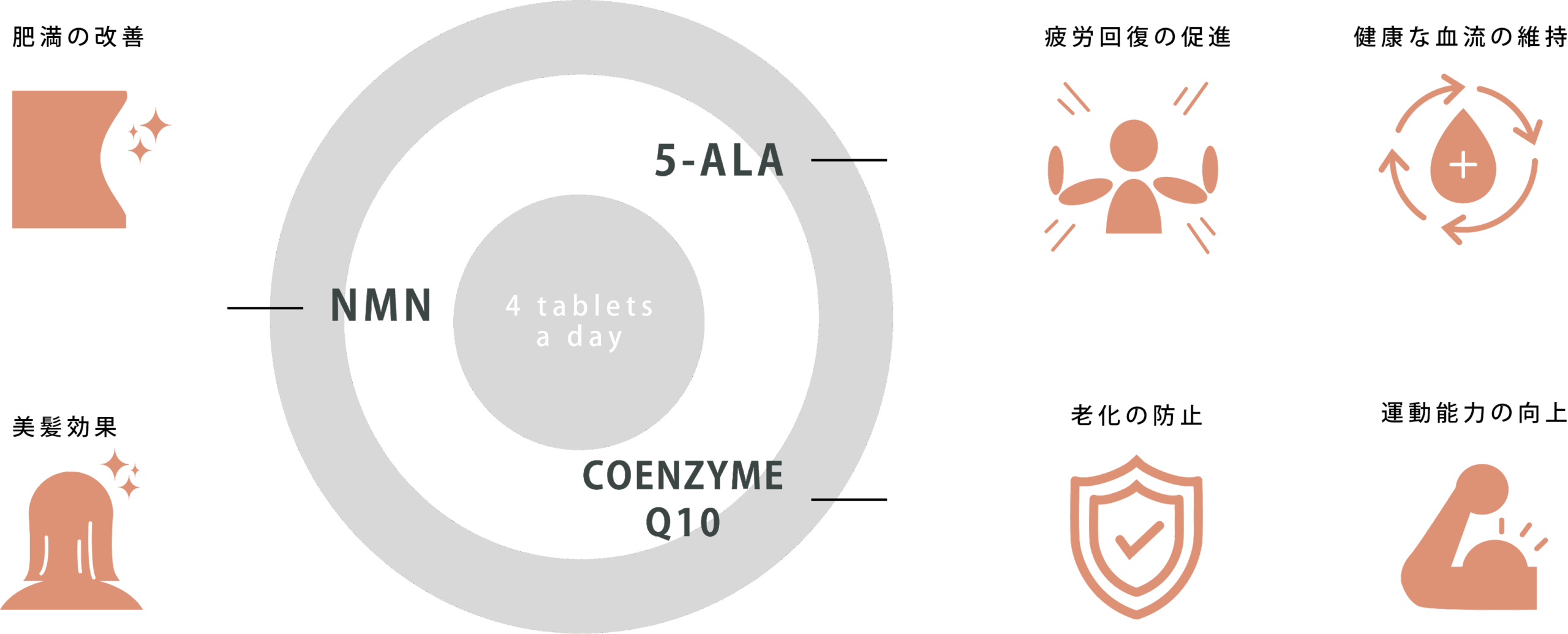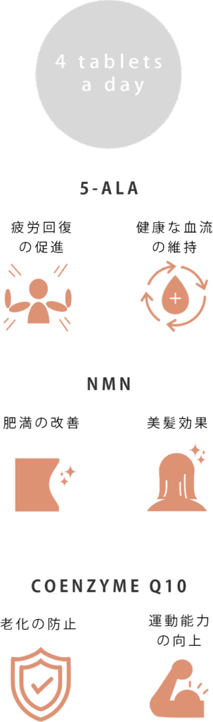 「5-ALA」「NMN」「CoQ10」―― それぞれが注目の成分を、「ETERNA(エテルナ)」なら手軽にまとめて摂れるので、忙しい毎日でも無理なく続けられます。1日わずか4粒で、毎日のコンディションづくりを意識するあなたにピッタリ!仕事も遊びも自分らしく楽しめる、素敵な毎日を過ごすための前向きなライフスタイルを「ETERNA(エテルナ)」がサポートする、新しい習慣の始まりです。