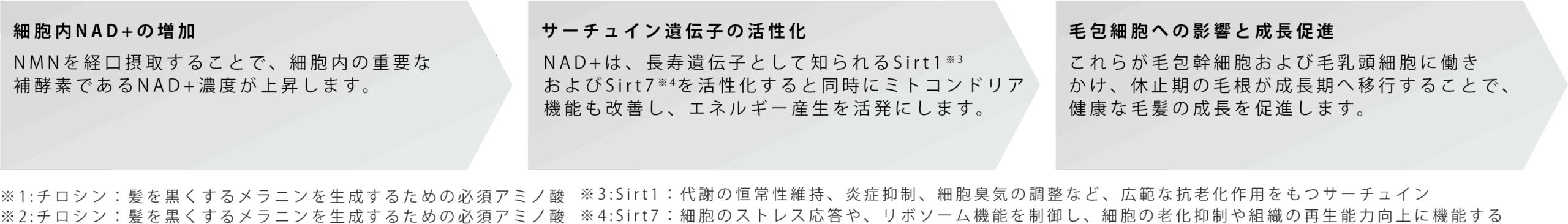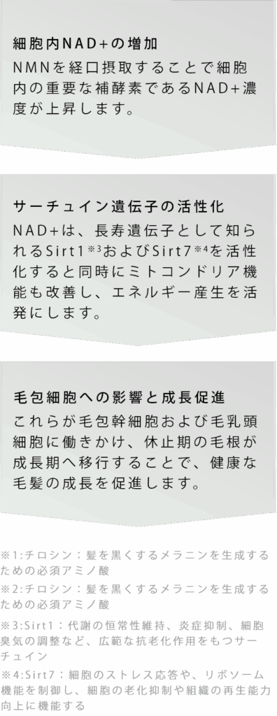 NMNは、体内でNAD+に変換される成分で、エネルギーを生み出す仕組みに関わっています。